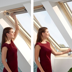 Классическая верхняя ручка-планка VELUX идеальна при установке окна на оптимальной высоте 90-120 см от пола. Рекомендовано ГОСТом. Окна с нижней ручкой удобны в случае, если окно расположено на высоте от 130 до 160 см от пола. Например, если в мансарде высокий пристенок.